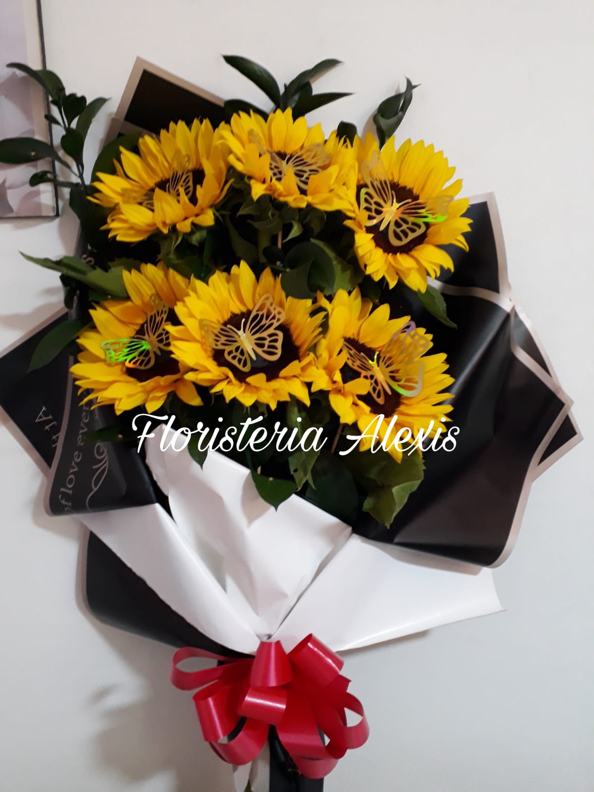 Hermoso Bouquet tipo princesa en girasoles, papel decorativo negro y mariposas