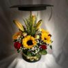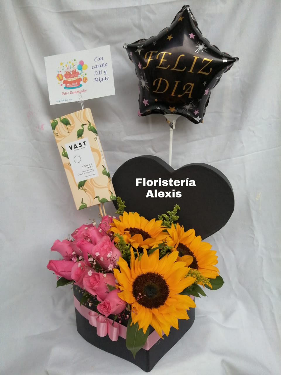 Hermosa caja en forma de corazón, con rosas y girasoles, acompañados de chocolates, globo de acuerdo a la ocasión y tarjeta
