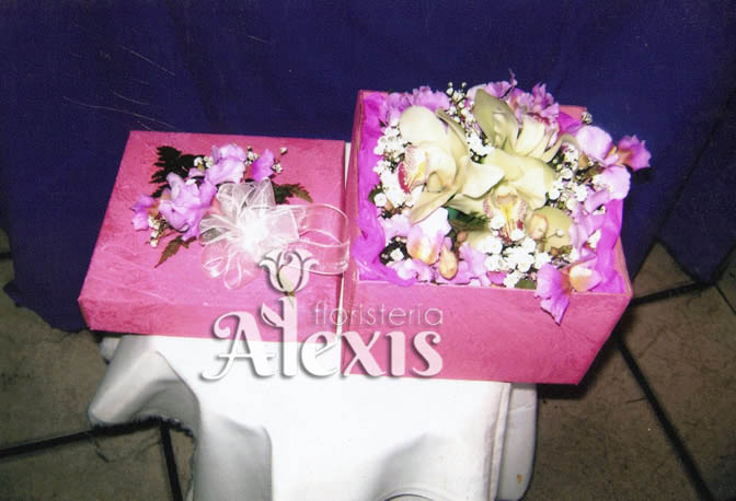 Caja cuadrada elaborada en variedad de orquídeas y follajes respectivos con un aplique en la tapa superior
