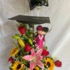 Hermosa caja cuadrada con rosas lineales, caja de chocolates y vino.