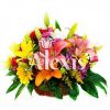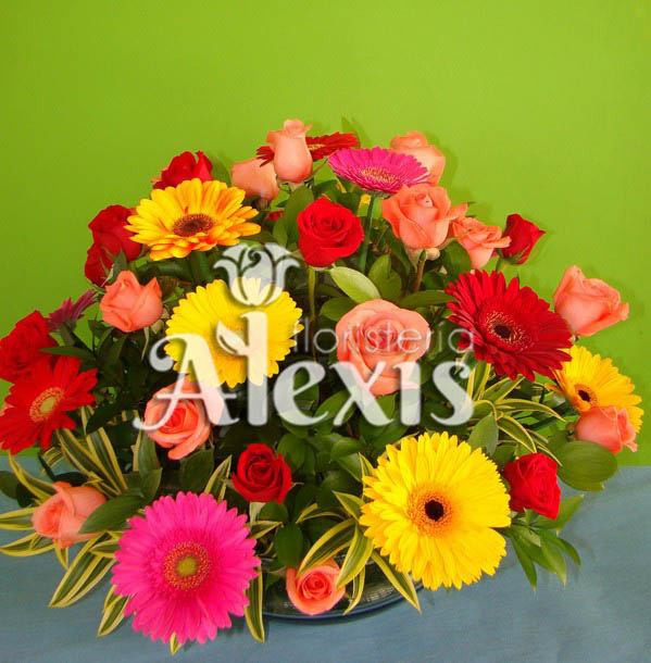 Diseño en canasta o base de vidrio elaborada en gerveras de colores y rosas surtidas con canciones de la india y sus follajes