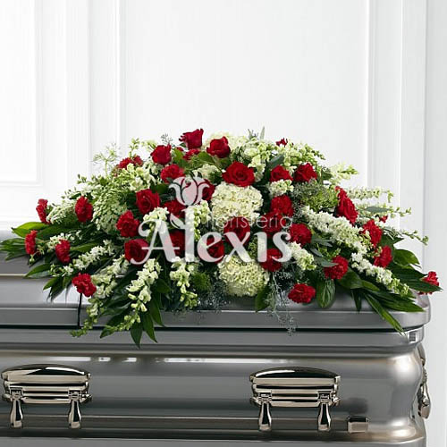 Cubre cajón elaborado en rosas, y hermosas hortensias, hojas verdes y follajes.