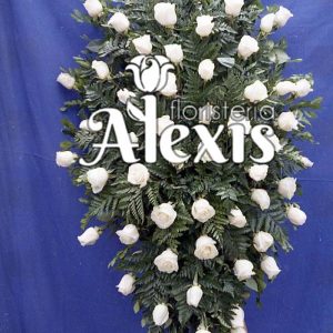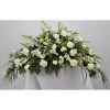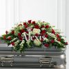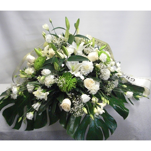 Lindo Cubre cajón elaborado en hojas de balazo en caida, con rosas crisantemos, lirios, hojas y follajes.