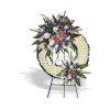 Corona elaborada en pompón o crisantemos blancos con gladiolos, lirios, hortensias hojas y follajes.