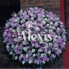 Corona de condolencias, elaborada en pompones blancos, hojas verdes, doble agrupación floral en rosas, cartuchos, lirios, gladiolos y belladonas.