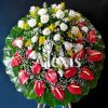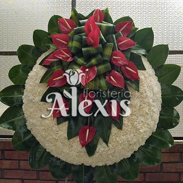 Corona elaborada en clavel o pompóm blanco, con anturios, hojas de dracena y follajes