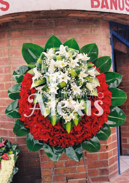 Corona fúnebre elaborada en rosas rojas lirios blancos o azucenas.