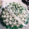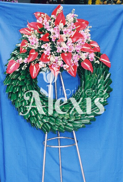 Corona elaborada en hojas de caucho con anturios, orquídeas hawaianas y follajes.