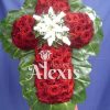 Elegante Corona fúnebre elaborada en pompones blancos con rosas roja.