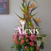 Elaborado en base de cerámica con variedad de flores exóticas rosas girasoles papiros orquídeas hawaianas y nativas con follajes y acompañado de globos