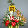 Elaborado en base de cerámica con girasoles aves anturios liatriz col cintillas hojas de balazo y follajes