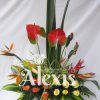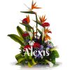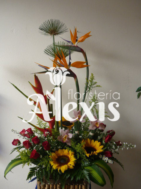 Elaborado en base de madera con heliconias aves del paraíso, papiros, girasoles, orquídeas cymbidium, hojas y follajes