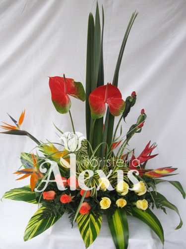 Elaborado en base de bambú o madera con hojas de lino anturios heliconias aves del paraíso canciones de la india rosas cintillas hojas y follajes