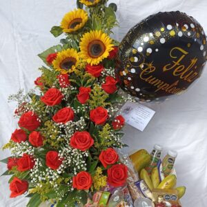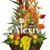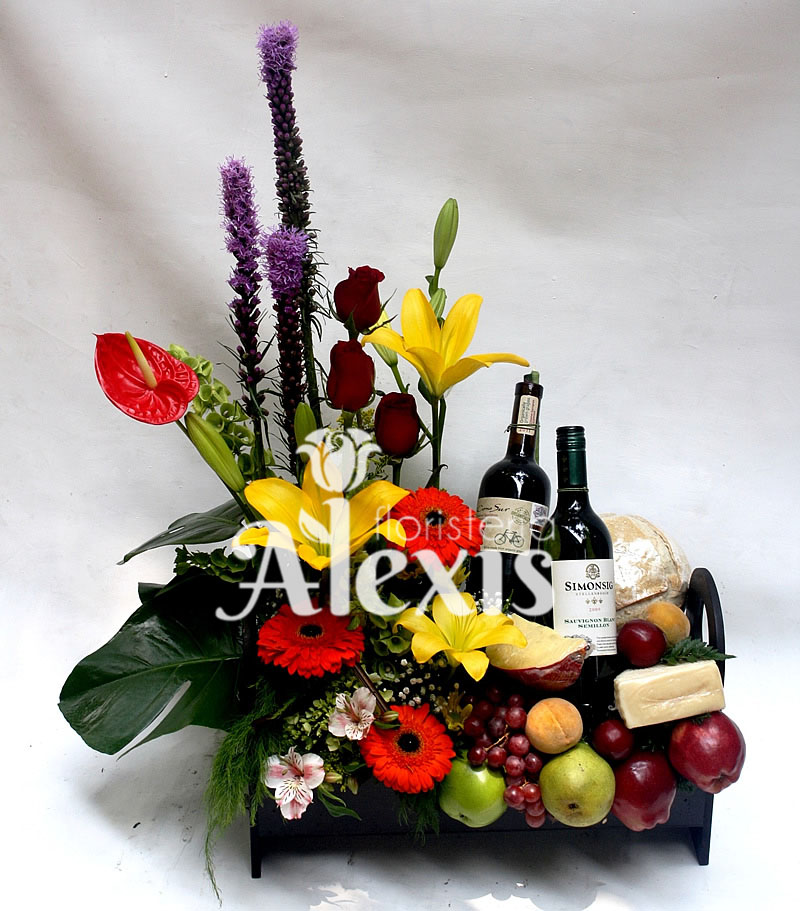 Diseño elaborado en base de madera con lirios rosas gerveras liatriz anturios hipéricos hojas y follajes acompañado de variedad de frutas dos botellas de vinos