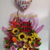 Precioso arreglo floral en rosas ordenas en espiral, girasol, rosas, gerveras, agrupacion de frutas y botella de cerveza