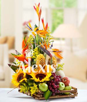Diseño elaborado en base de bambú o madera con variedad de flores exóticas girasoles aves del paraíso follajes y hojas con variedad de frutas frescas.