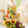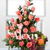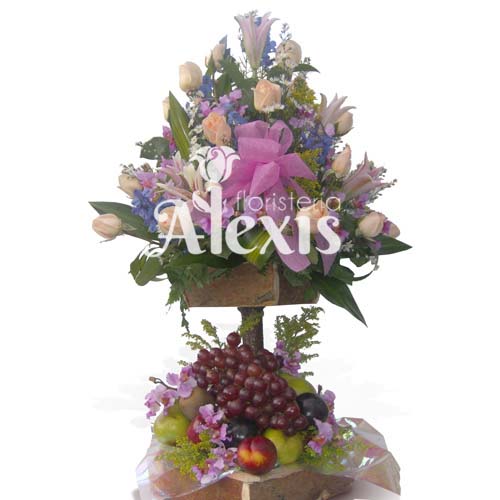 Diseño elaborado en base de dos tiempos en madera o bambú con orquídeas rosas y lirios con follajes y hojas con variedad de frutas