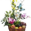 Diseño elaborado en base de canasta con rosas rosadas el color puede ser opcional con follajes y variedad de frutas