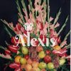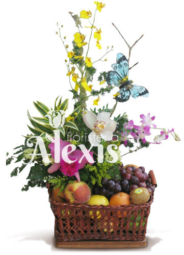 Diseño elaborado en base canasto con variedad de orquídeas chamizos canción de la india follajes y hojas con variedad de frutas frescas