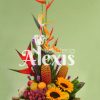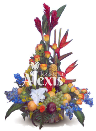 Diseño elaborado en base de bambú o cerámica con variedad de flores de exóticas rosas lirios belladonas follajes y hojas con frutas frescas acompañado de botella de licor.