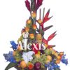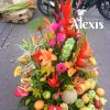 Diseño elaborado en base bambú con flores exóticas con girasoles liatriz y variedad de frutas frescas.