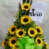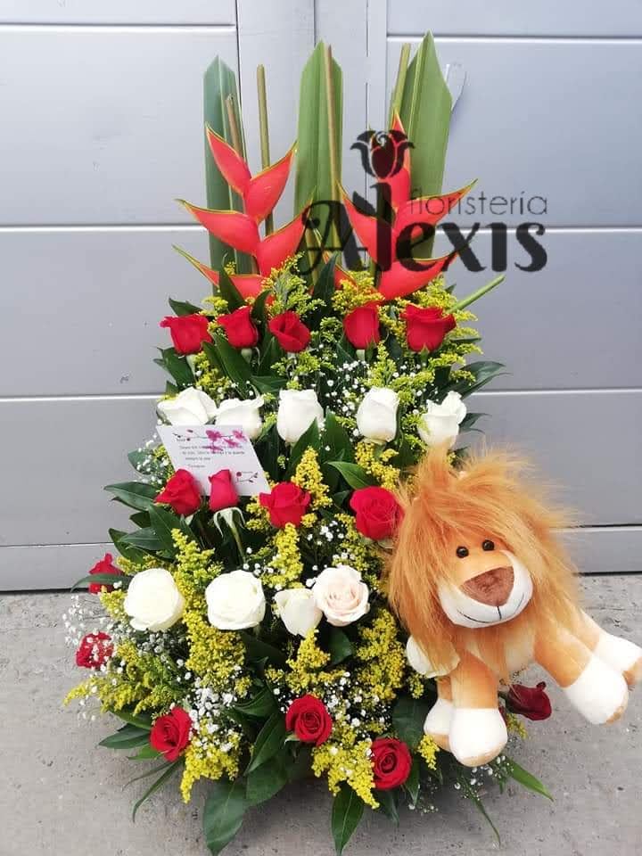 Diseño elaborado en base de madera con rosas de colores o el color de su elección, heliconeas, solidago, gipsofilia y follajes verdes.