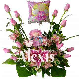 Diseño elaborado en base de madera o bambú con rosas lirios orquídeas y follajes acompañado de peluche y globo.
