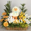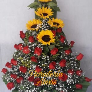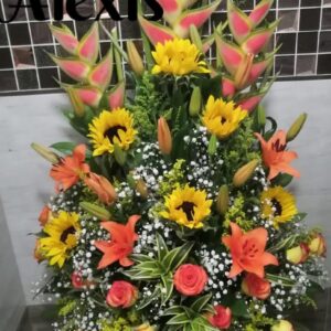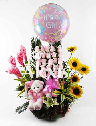 Diseño elaborado con lirios, rosas del color a su elección, gingeres, girasoles, canciones de la india y follajes acompañada de globo acorde a la ocasión y oso de peluche.