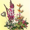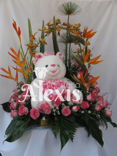 Diseño elaborado en base de en base de madera con rosa cimbidyum nativas ópalos papiros hojas de lino helechos y follajes acompañado de peluche.