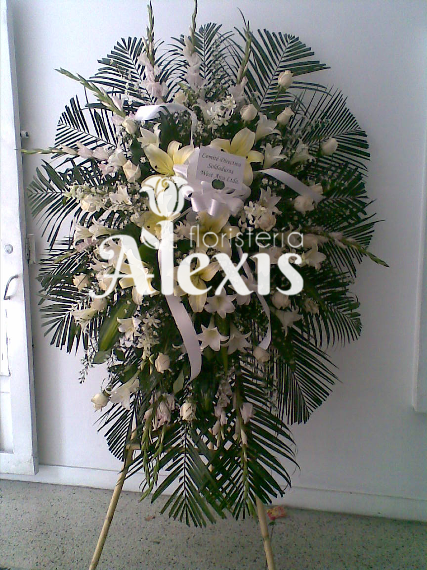 Pedestal elaborado en palmas, rosas blancas, lirios o azucenas, bocas de dragón y follajes.