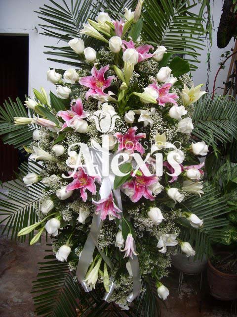 Pedestal elaborado en lirios rosados y blancos con rosa blanca hojas o de su elección y follajes.