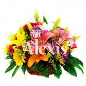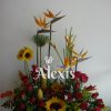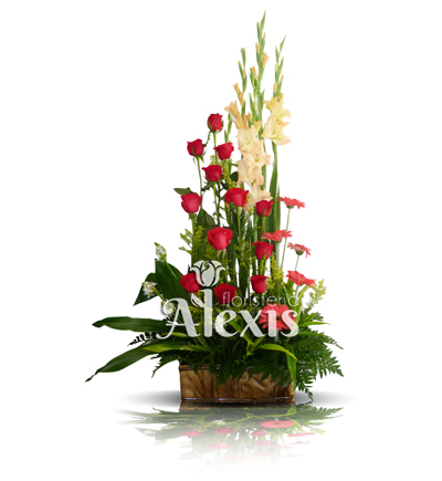 Diseño elaborado en base rustica o de madera con rosas gerveras y gladiolos con follajes